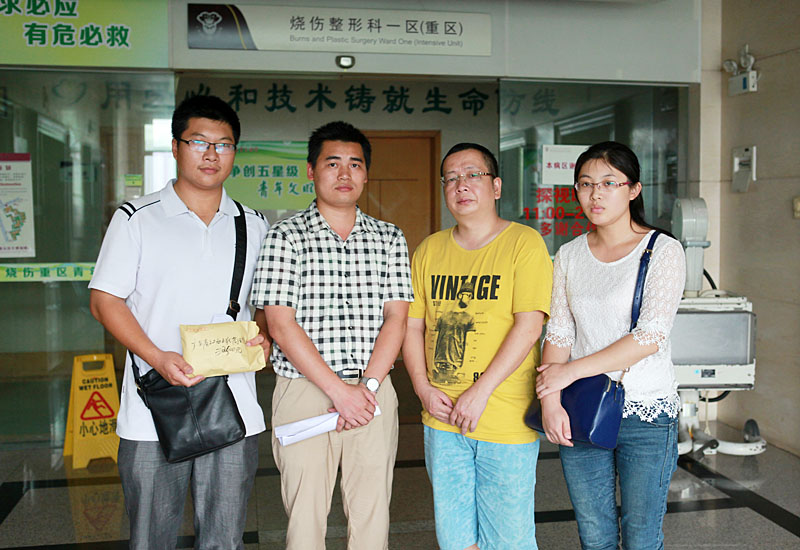 同時,廣東省江西上猶商會在得知此事后,會長劉易文指示秘書處組織、發起愛心捐款活動。上猶商會各理事會員積極響應捐款,短短幾天時間已籌集善款三萬多元。2014年6月10日下午,商會常務副會長賴厚平及商會秘書處組織副會長朱復郴、秘書孔凡順及博皓公司代表組成3人探訪團,親到廣州紅十字會醫院探望李明亮夫婦,并送上了這筆愛心捐款。副會長朱復郴慰問了患者并詳細詢問了其家屬情況,對其籌款近況提出了相應的建議,同時鼓勵李劍、李婷面對困難要堅強。李劍,李婷及其家屬對商會代表的到訪和愛心捐助表示衷心感謝!